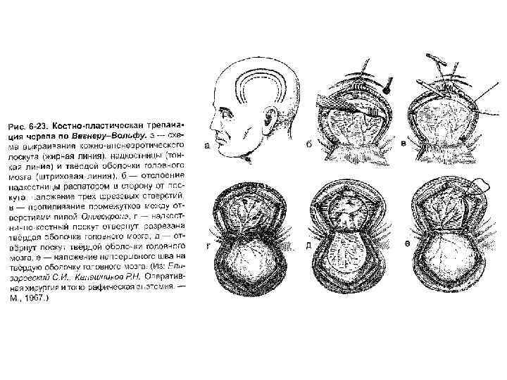 Операцию заканчивают: • ушиванием твердой мозговой оболочки, • укладыванием на место кожнонадкостнично-костного лоскута • наложением кетгутовых швов на надкостницу • ушиванием кожно-апоневротического лоскута.