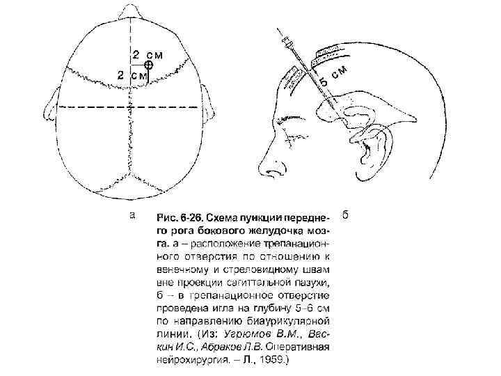 Пункция передних рогов боковых желудочков головного мозга. Техника. Проводится срединная линия, соответствующая стреловидному шву – от глабеллы до наружного затылочного выступа. Намечается линия венечного шва (на 10 -11 см выше надбровных дуг). Место пересечения обоих швов в точке пересечения перпендикулярной линии, проведенной от середины скуловой дуги со стреловидным швом. Место прокола желудочка на 2 см кнаружи от стреловидного шва и на 2 см кпереди от венечного шва.