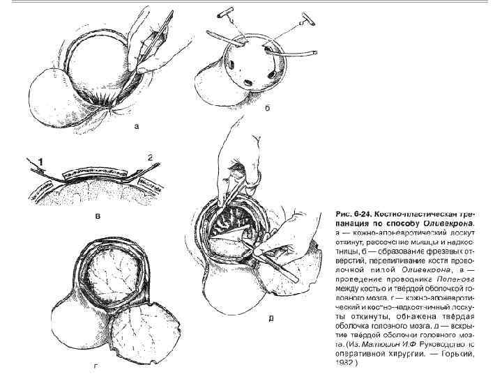 4 - Между двумя соседними трепанационными отверстиями вводят желобоватый проводник Поленова, поверх него проводят пилу Оливекрона (Джильи) и перепиливают кость. 5 - Такую манипуляцию проделывают между остальными отверстиями, за исключением нижней поперечной линии, которую слегка надпиливают и надламывают. Проведение проводника Поленова между костью и твердой мозговой оболочкой