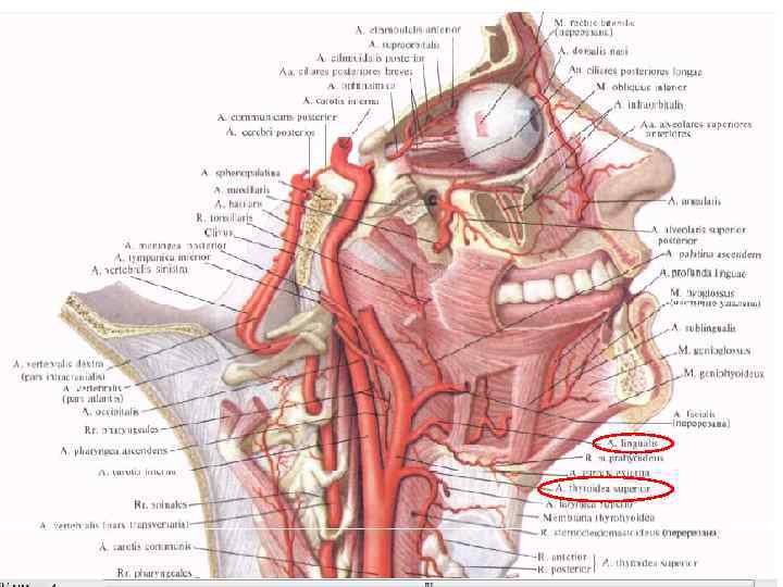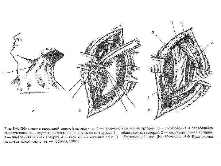 Оперативный доступ и перевязка наружной сонной артерии. Перевязка наружной сонной артерии (a. carotis externa) обычно переносится без серьезных осложнений и может быть использована как предварительный этап при резекции верхней челюсти. Ошибочная перевязка внутренней сонной артерии вместо наружной в 50 % случаев может привести к гибели пациента или глубокой инвалидизации. Причиной смертельных осложнений чаще всего может служить тромбоз внутренней сонной артерии.