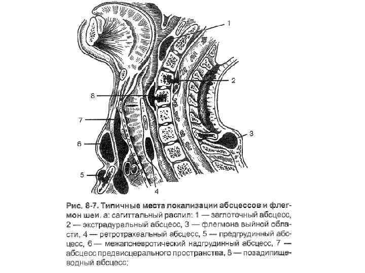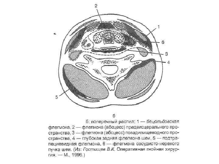 Флегмону предвисцерального пространства вскрывают поперечным или воротникообразным разрезом, при распространении процесса на переднее средостение показана шейная медиастинотомия. Флегмоны позадивисцерального пространства вскрывают разрезом вдоль переднего края грудиноключично-сосцевидной мышцы.