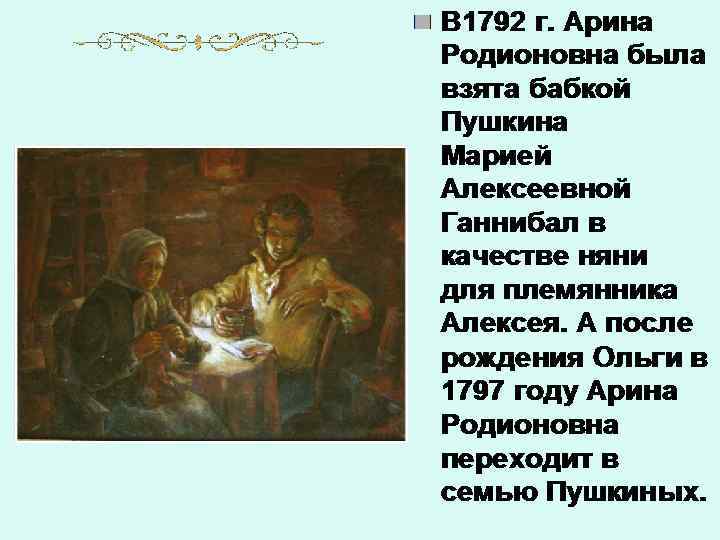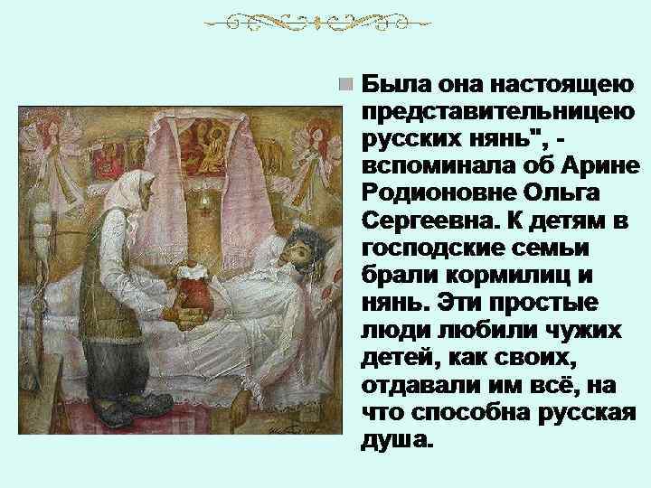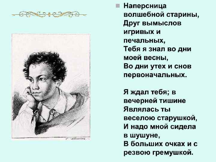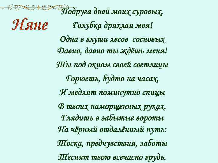 • С любовью и уважением относился Пушкин к няне. Немало стихотворений посвятил ей. Называл её «подругой юности» своей, «ангелом кротким, безмятежным» , «бесценным другом» . Он доверял ей свои мысли, мечты. Нередко Арина Родионовна становилась первой слушательницей его сочинений: • Я плоды своих скитаний, И гармонических статей Читаю только старой няне – Подруге юности моей.
