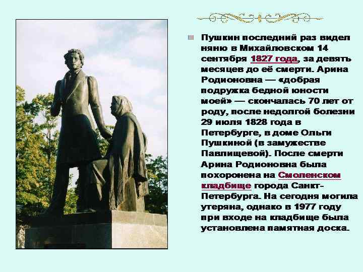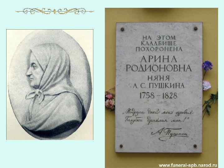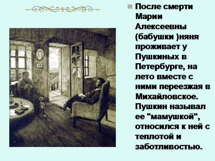 • Как одну из горестных утрат своей жизни переживал её кончину Пушкин. Нередко на полях страниц своих сочинений он рисовал профильные портреты любимой няни. Даже спустя десять лет, побывав в селе Михайловском, он напишет: • …Вновь я посетил Тот уголок земли, где я провел Изгнанником два года незаметных. Уж десять лет ушло с тех пор – и много Переменилось в жизни для меня (…) …но здесь опять Минувшее меня объемлет живо (…) Вот опальный домик, Где жил я с бедной нянею моей. Уже старушки нет – уж за стеною Не слышу я шагов её тяжелых, Ни кропотливого её дозора…