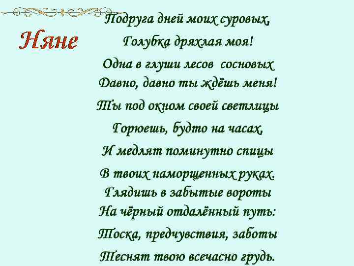 Зимний вечер. • Буря мглою небо кроет, Вихри снежные крутя; То, как зверь, она завоет, То заплачет, как дитя, То по кровле обветшалой Вдруг соломой зашумит, То, как путник запоздалый, К нам в окошко застучит. • Наша ветхая лачужка И печальна и темна. Что же ты, моя старушка, Приумолкла у окна? Или бури завываньем Ты, мой друг, утомлена, Или дремлешь под жужжаньем Своего веретена? • Выпьем, добрая подружка Бедной юности моей, Выпьем с горя; где же кружка? Сердцу будет веселей. Спой мне песню, как синица Тихо за морем жила; Спой мне песню, как девица За водой поутру шла. • Буря мглою небо кроет, Вихри снежные крутя; То, как зверь, она завоет, То заплачет, как дитя. Выпьем, добрая подружка Бедной юности моей, Выпьем с горя; где же кружка? Сердцу будет веселей. • 1825.