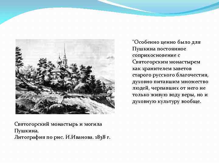 "Особенно ценно было для Пушкина постоянное соприкосновение с Святогорским монастырем как хранителем заветов старого русского благочестия, духовно питавшим множество людей, черпавших от него не только живую воду веры, но и духовную культуру вообще. Святогорский монастырь и могила Пушкина. Литография по рис. И. Иванова. 1838 г.