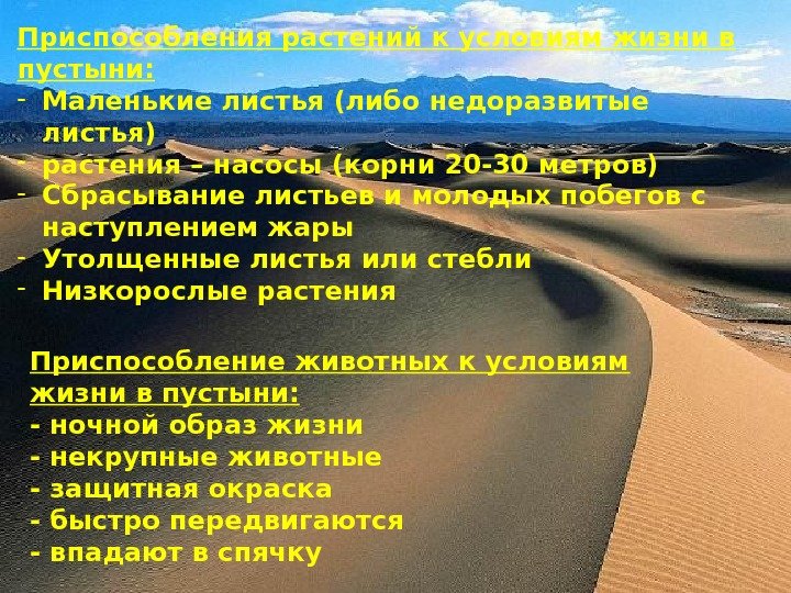 Приспособление животных к условиям жизни в пустыни: — ночной образ жизни — некрупные животные — защитная окраска — быстро передвигаются — впадают в спячку. Приспособления растений к условиям жизни в пустыни: — Маленькие листья (либо недоразвитые листья) — растения – насосы (корни 20 -30 метров) — Сбрасывание листьев и молодых побегов с наступлением жары — Утолщенные листья или стебли — Низкорослые растения