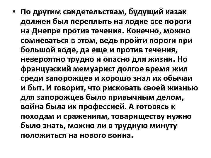 • По другим свидетельствам, будущий казак должен был переплыть на лодке все пороги на Днепре против течения. Конечно, можно сомневаться в этом, ведь пройти пороги при большой воде, да еще и против течения, невероятно трудно и опасно для жизни. Но французский мемуарист долгое время жил среди запорожцев и хорошо знал их обычаи и быт. И говорит, что рисковать своей жизнью для запорожцев было привычным делом, война была их профессией. А готовясь к походам и сражениям, товариществу нужно было знать, можно ли в трудную минуту положиться на нового воина.