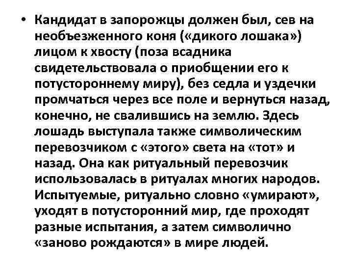 • Кандидат в запорожцы должен был, сев на необъезженного коня ( «дикого лошака» ) лицом к хвосту (поза всадника свидетельствовала о приобщении его к потустороннему миру), без седла и уздечки промчаться через все поле и вернуться назад, конечно, не свалившись на землю. Здесь лошадь выступала также символическим перевозчиком с «этого» света на «тот» и назад. Она как ритуальный перевозчик использовалась в ритуалах многих народов. Испытуемые, ритуально словно «умирают» , уходят в потусторонний мир, где проходят разные испытания, а затем символично «заново рождаются» в мире людей.