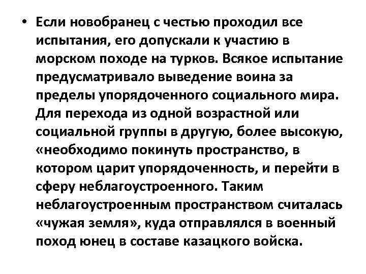 • Если новобранец с честью проходил все испытания, его допускали к участию в морском походе на турков. Всякое испытание предусматривало выведение воина за пределы упорядоченного социального мира. Для перехода из одной возрастной или социальной группы в другую, более высокую, «необходимо покинуть пространство, в котором царит упорядоченность, и перейти в сферу неблагоустроенного. Таким неблагоустроенным пространством считалась «чужая земля» , куда отправлялся в военный поход юнец в составе казацкого войска.