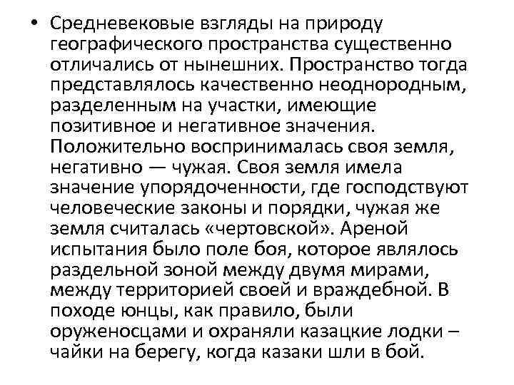 • Средневековые взгляды на природу географического пространства существенно отличались от нынешних. Пространство тогда представлялось качественно неоднородным, разделенным на участки, имеющие позитивное и негативное значения. Положительно воспринималась своя земля, негативно — чужая. Своя земля имела значение упорядоченности, где господствуют человеческие законы и порядки, чужая же земля считалась «чертовской» . Ареной испытания было поле боя, которое являлось раздельной зоной между двумя мирами, между территорией своей и враждебной. В походе юнцы, как правило, были оруженосцами и охраняли казацкие лодки – чайки на берегу, когда казаки шли в бой.