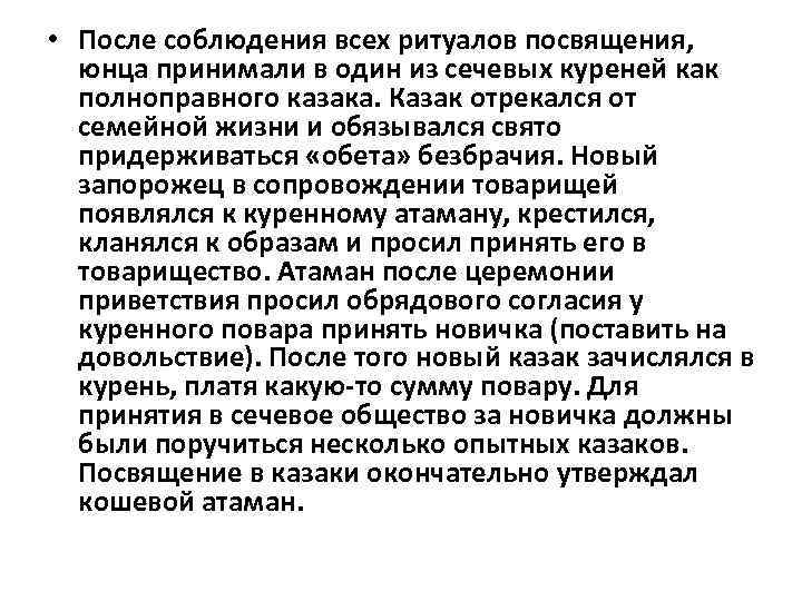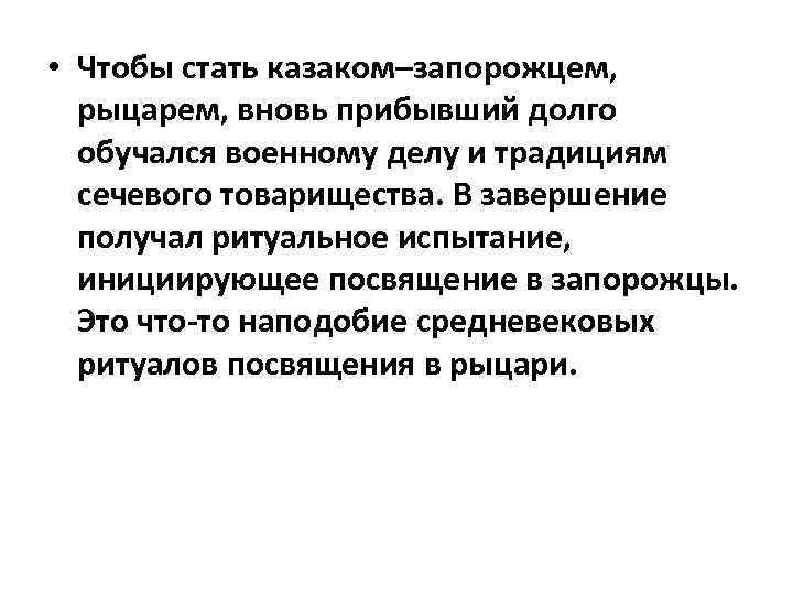 • Чтобы стать казаком–запорожцем, рыцарем, вновь прибывший долго обучался военному делу и традициям сечевого товарищества. В завершение получал ритуальное испытание, инициирующее посвящение в запорожцы. Это что-то наподобие средневековых ритуалов посвящения в рыцари.