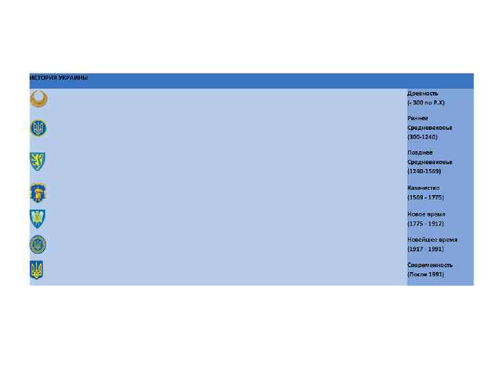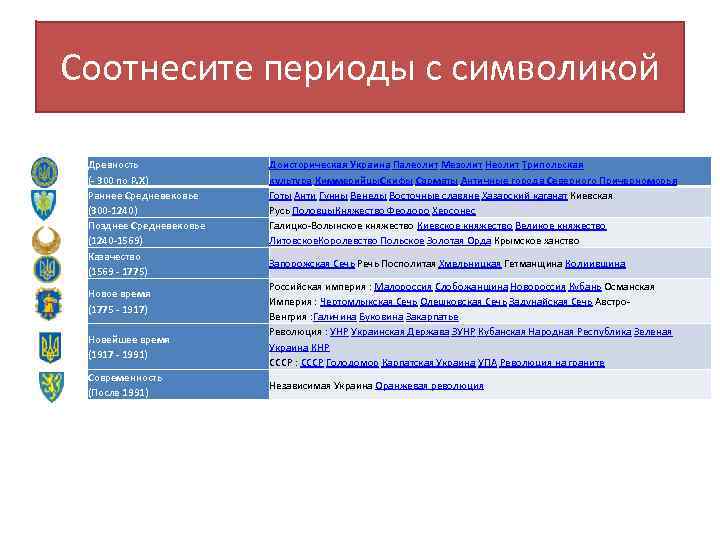 Соотнесите периоды с символикой Древность (- 300 по Р. Х) Раннее Средневековье (300 -1240) Позднее Средневековье (1240 -1569) Казачество (1569 - 1775) Новое время (1775 - 1917) Новейшее время (1917 - 1991) Современность (После 1991) Доисторическая Украина Палеолит Мезолит Неолит Трипольская культура Киммерийцы. Скифы Сарматы Античные города Северного Причерноморья Готы Анти Гунны Венеды Восточные славяне Хазарский каганат Киевская Русь Половцы. Княжество Феодоро Херсонес Галицко-Волынское княжество Киевское княжество Великое княжество Литовское. Королевство Польское Золотая Орда Крымское ханство Запорожская Сечь Речь Посполитая Хмельницкая Гетманщина Колиивщина Российская империя : Малороссия Слобожанщина Новороссия Кубань Османская Империя : Чертомлыкская Сечь Олешковская Сечь Задунайская Сечь Австро. Венгрия : Галичина Буковина Закарпатье Революция : УНР Украинская Держава ЗУНР Кубанская Народная Республика Зеленая Украина КНР СССР : СССР Голодомор Карпатская Украина УПА Революция на граните Независимая Украина Оранжевая революция