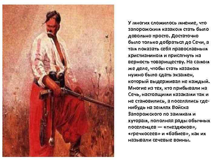 У многих сложилось мнение, что запорожским казаком стать было довольно просто. Достаточно было только добраться до Сечи, а там показать себя православным христианином и присягнуть на верность товариществу. На самом же деле, чтобы стать казаком нужно было сдать экзамен, который выдерживал не каждый. Многие из тех, кто прибывали на Сечь, настоящими казаками так и не становились, а поселялись гденибудь на землях Войска Запорожского по заимкам и хуторам, пополняя ряды обычных поселенцев — «гнездюков» , «гречкосеев» и «бабиев» , как их называли сечевые воины.