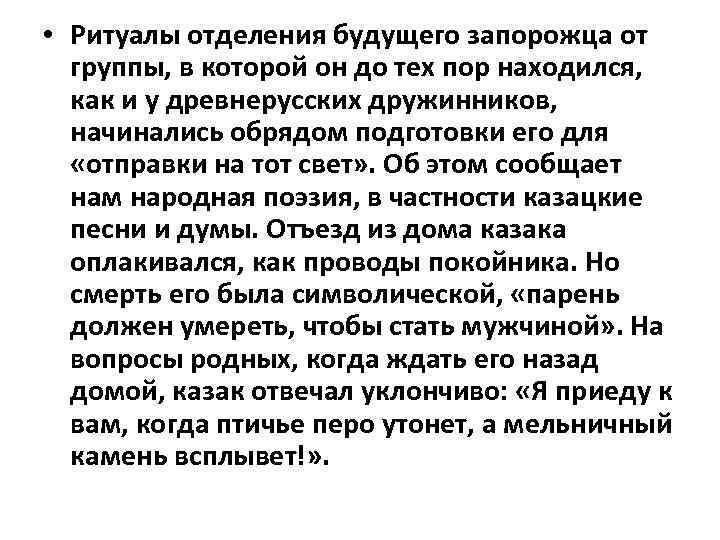 • Ритуалы отделения будущего запорожца от группы, в которой он до тех пор находился, как и у древнерусских дружинников, начинались обрядом подготовки его для «отправки на тот свет» . Об этом сообщает нам народная поэзия, в частности казацкие песни и думы. Отъезд из дома казака оплакивался, как проводы покойника. Но смерть его была символической, «парень должен умереть, чтобы стать мужчиной» . На вопросы родных, когда ждать его назад домой, казак отвечал уклончиво: «Я приеду к вам, когда птичье перо утонет, а мельничный камень всплывет!» .