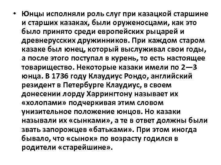 • Юнцы исполняли роль слуг при казацкой старшине и старших казаках, были оруженосцами, как это было принято среди европейских рыцарей и древнерусских дружинников. При каждом старом казаке был юнец, который выслуживал свои годы, а после этого поступал в курень, то есть настоящее товарищество. Некоторые казаки имели по 2— 3 юнца. В 1736 году Клаудиус Рондо, английский резидент в Петербурге Клаудиус, в своем донесении лорду Харрингтону называет их «холопами» подчеркивая этим словом унизительное положение юнцов. Но казаки называли их «сынками» , а те в ответ должны были звать запорожцев «батьками» . При этом иногда бывало, что «сынок» по возрасту годился в родители «старейшине» .