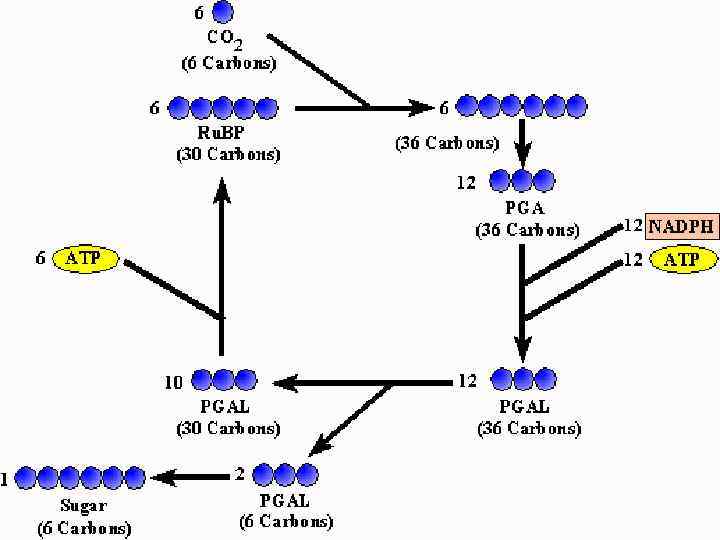 Темновая фаза фотосинтеза Рибулозомонофосфат Аминокислоты АТФ Глюкоза 1 АДФ + Ф 6 2 Триозофосфат НАДФ+ НАДФ*Н+Н 5 Рибулозодифосфат 2 Цикл Кальвина – Бенсона 4 Дифосфоглицерат 3 СО 2 Фосфоглицерат АТФ АДФ + Ф