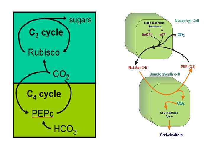 Клетки мезофилла Клетки обкладки ФЕП-карбоксилаза Рубиско Фотосистемы I и II Фотосистема II Нециклическое и циклическое фотофосфорилирование Цикл Хэтча-Слэка Циклическое фотофосфорилирование Цикл Кальвина