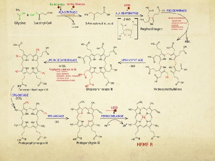 Environmental and Metabolic Influences: Lead (inhibits ALA Dehydratase), second enzyme in the pathway, displaces zinc from its binding site on the enzyme Drugs, hormones, and nutritional alterations are important in precipitating attacks of neurovisceral symptoms in acute porphyrias, hormonal changes associated with the luteal phase of the menstrual cycle, drugs that increase CYP pathways.