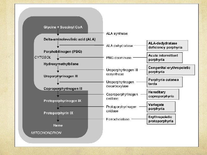 Diseases associated with Alterations in Heme Biosynthetic Pathway Enzymes (see diagram 2) ALA Synthase 1: mutations have not been described, but upregulation of hepatic ALAS 1 is an important feature during exacerbations of acute hepatic Porphyrias. ALA Synthase 2: present in many cases of X-linked Sideroblastic Anemia. Gain of function ALAS 2 mutations have been described in a variant form of EPP (Erythropoietic Protoporphyria), known as X-linked Protoporphyra Each of the subsequent enzymes in the heme synthetic pathway is deficient in a specific type of porphyria (see diagrams) Our focus today will be on AIP