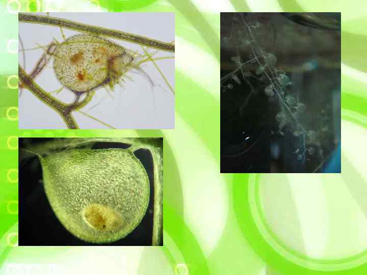 Механизм питания На листьях находятся ловчие пузырьки, из-за которых этот род получил свое название (латинское слово "utricula" переводится как "мешочек", "пузырек"). Молодые пузырьки бледно-зеленоватые, косояйцевидные или шаровидные, у разных видов они имеют размеры от 2 до 5 мм. В пузырьке имеется "ротовое отверстие", герметично закрытое клапаном открывающемся только внутрь, при основании которого находятся длинные разветвленные волоски, "антенны". На наружной стороне клапана имеются желёзки, выделяющие клейкое вещество и сахар и тем самым заманивающие в это опасное место мелких водных животных, а ткань самого пузырька способна удалять из него воду, создавая внутри разрежение.