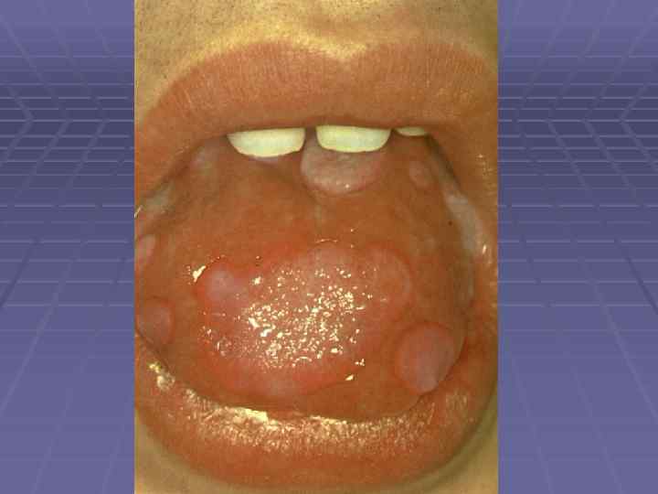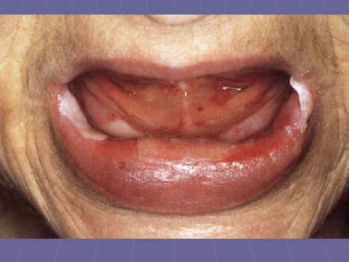 Доброкачественная пузырчатка только слизистой полости рта Пашкова - Шеклакова § Возникают рецидивирующие пузыри, которые вскрываются и образуют болезненные эрозии, заживающие рубцеванием; § При локализации высыпаний на уздечке языка, образуются спайки, приводящие к ограничению его подвижности; § При поражении пищевода постепенно формируется его стриктура, что приводит к нарушению питания.