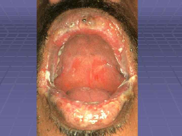 Вульгарная пузырчатка § Характерна стадийность: дебют – распространение – § § § § разгар; Чаще болеют люди 40 -60 лет; Начинается со слизистой полости рта; Локализация: ретромалярная область, ККГ, боковая поверхность языка, зев, подъязычная область, небо; Пузыри с тонкой дряблой покрышкой, заполнены мутным содержимым; Резко болезненные эрозии, имеют тенденцию к слиянию и периферическому росту; Затруднение глотания, жевания, избыточная саливация; Заживление без рубцевания