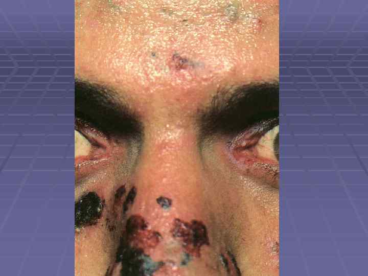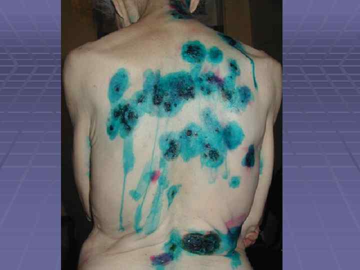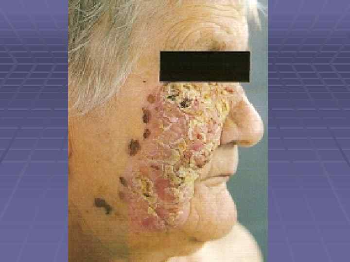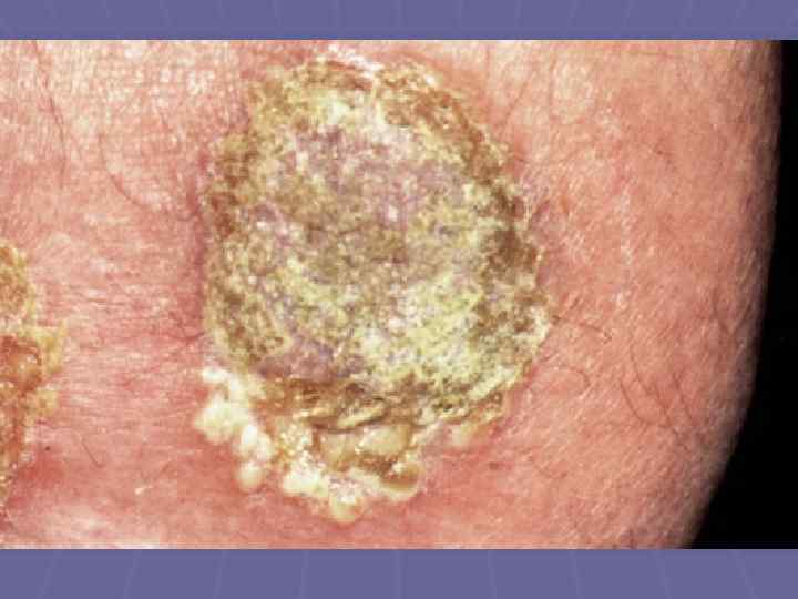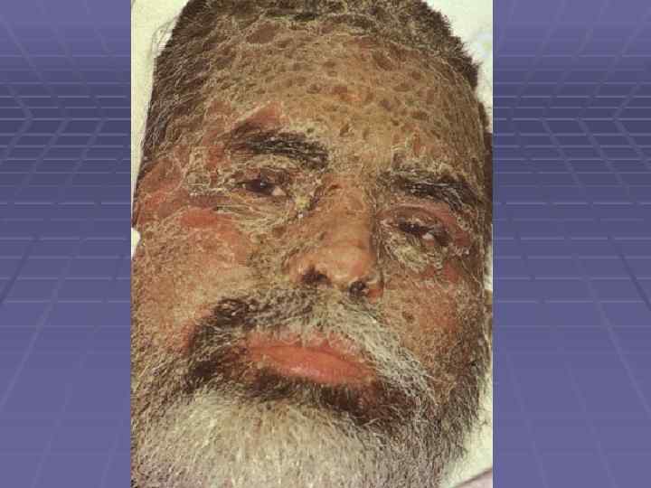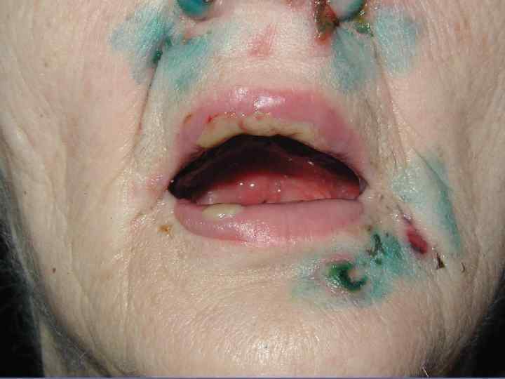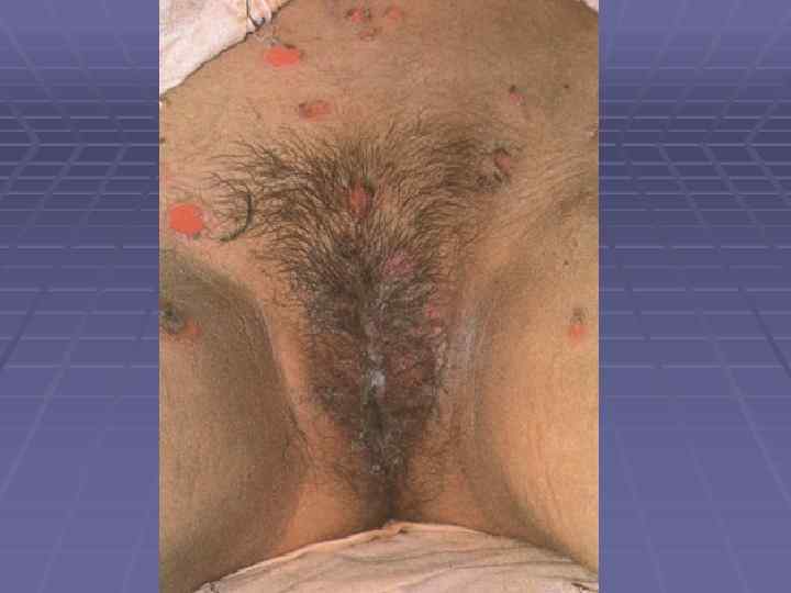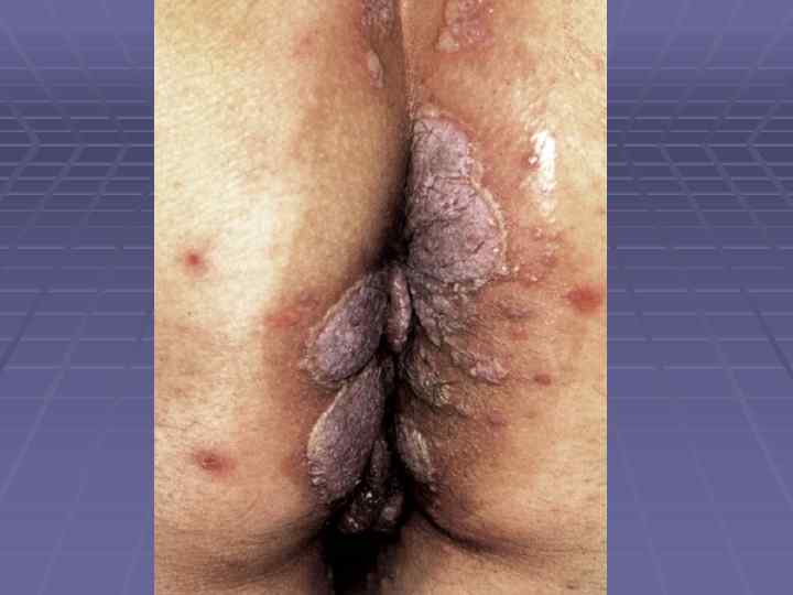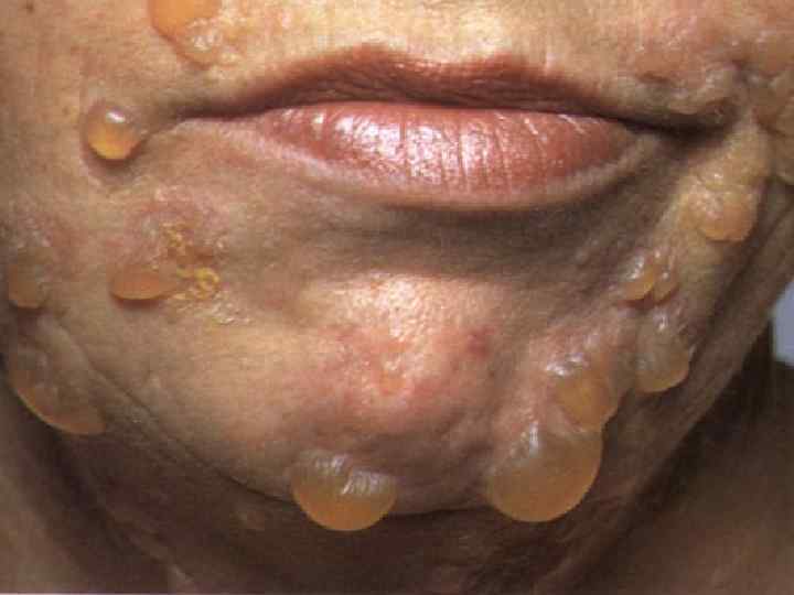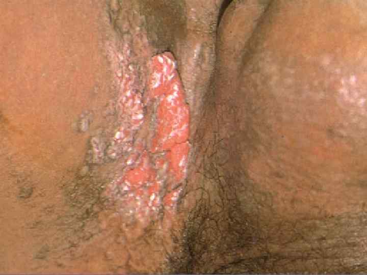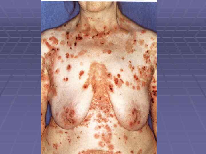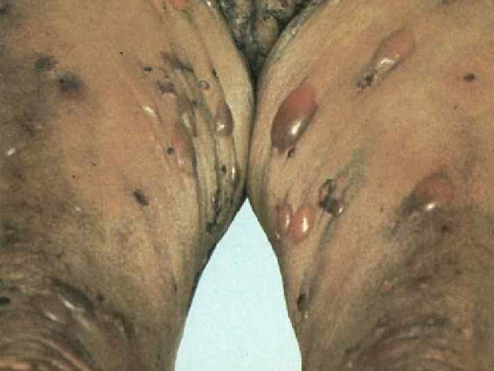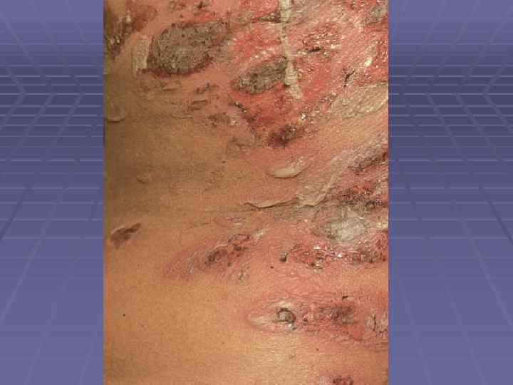 Вегетирующая пузырчатка § Начинается со слизистой полости рта; § Локализация – в крупных складках (подмышечная область, под молочными железами, паховые складки, вокруг естественных отверстий); § 1 тип – Ньюмана (классический) – образование вялых пузырей, после вскрытия – вегетирующие очаги с гиперкератозом, образуются корки грязно-серого цвета с болезненными трещинами и зловонным запахом; § 2 тип – Галлопо – «вегетирующая пиодермия» присоединение вторичной инфекции, сгруппированные желтоватые пустулы, ихорозный (зловонный) запах