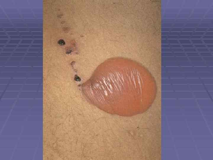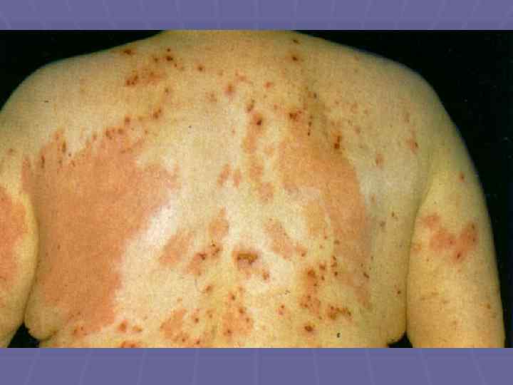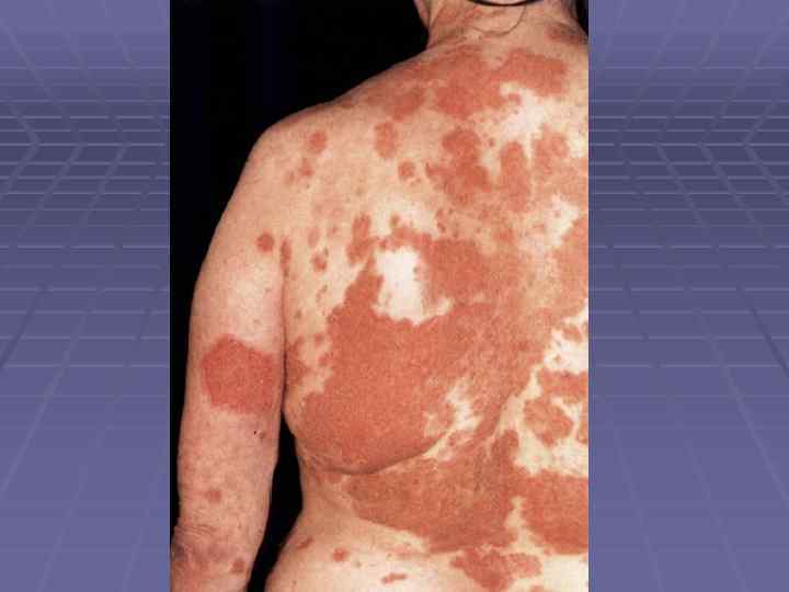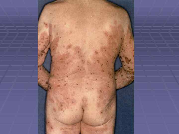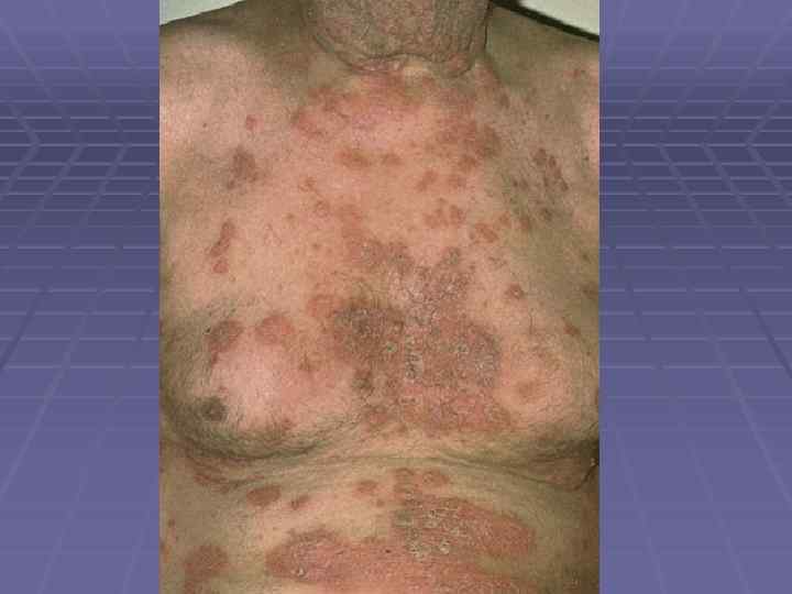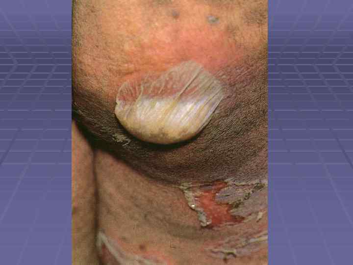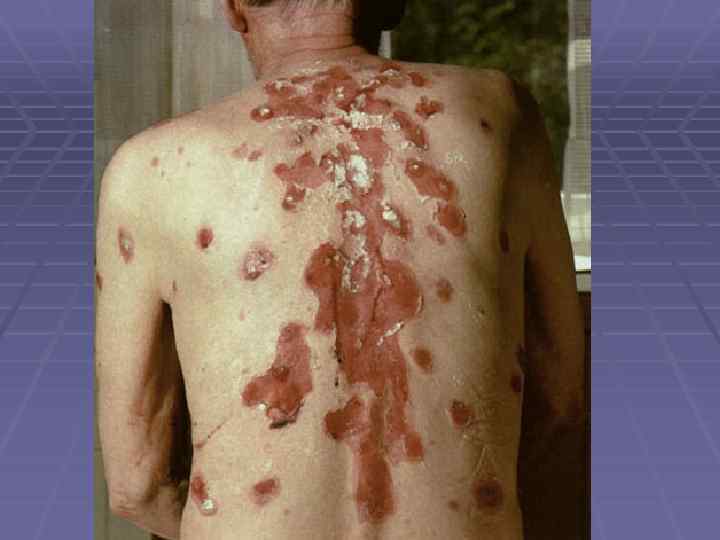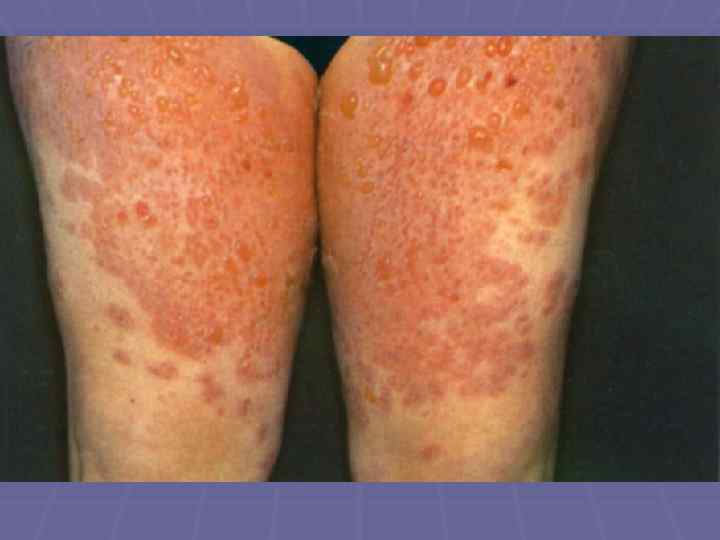 Пемфигоид Левера § Болеют преимущественно мужчины после 40 лет; § Локализация – верхние и нижние конечности, живот, § § § § § паховые складки, подмышечные области, паховые складки; Большие, напряженные пузыри, не имеют тенденции к периферическому росту; Симптом Никольского отрицательный; Эрозии эпителизируются и оставляют пигментацию; При распространенных высыпаниях на коже поражаются слизистые и придатки кожи; Высыпания сопровождаются жжением, болью, резью; Не склонны к самопроизвольному излечению; Заболевание резистентно к проводимой терапии; Связано с паранеопластическими процессами; Хроническое рецидивирующее течение
