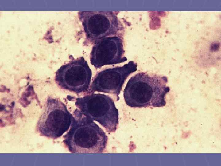 Клетки Тцанка § Акантолитические клетки; § Измененные клетки шиповатого слоя; § Меньших размеров, чем нормальные § § § эпидермоциты; Интенсивно окрашенное ядро; Наличие 2 -3 ядрышек; Базофильно, неоднородно окрашивающаяся цитоплазма: вокруг ядра образуется светлоголубая зона, а по периферии – сгущение окраски в виде интенсивного синего ободка;