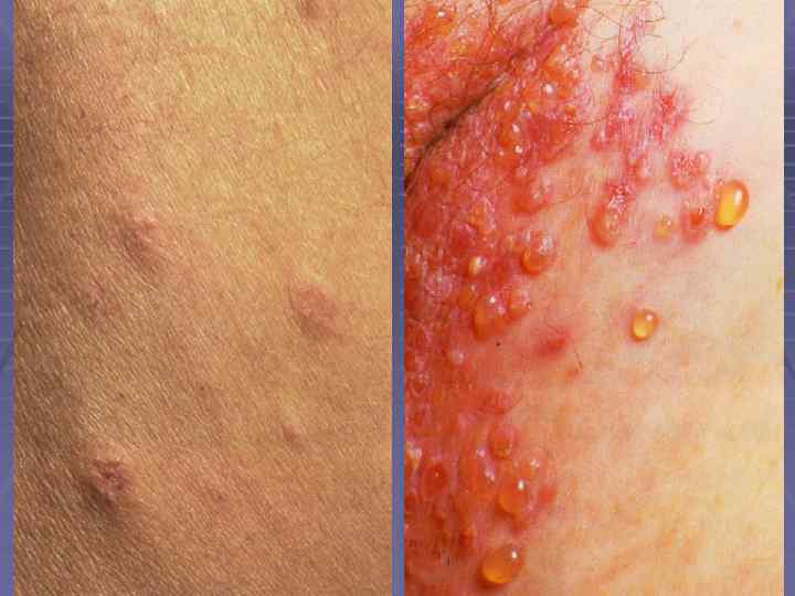 Варианты пемфигоида Левера § Локализованный – локализуются на нижних конечностях; § Везикулезный – более мелкие пузыри группируются на туловище и конечностях, сопровождаются сильным зудом и весьма напоминают проявления герпетиформного дерматоза; § Вегетирующий – помимо буллезных высыпаний на туловище и конечностях имеются вегетирующие очаги в крупных складках; § Себорейный – клинически напоминает проявления эритематозной пузырчатки, но гистологическое исследование кожи обнаруживает субэпителиальный пузырь