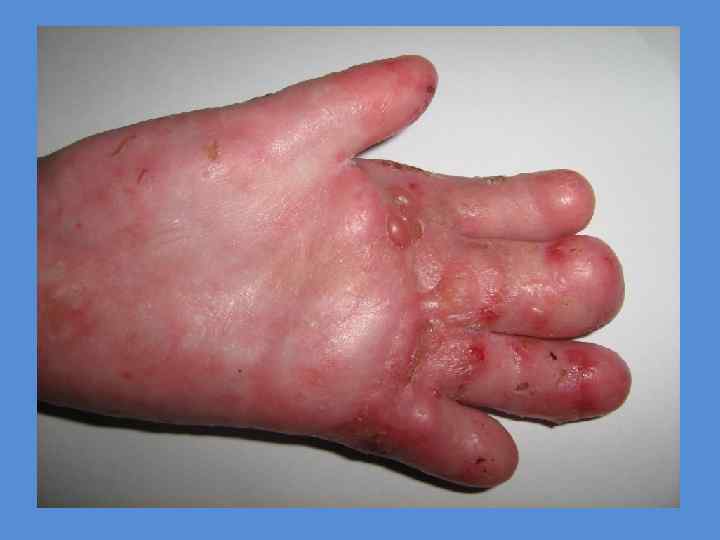 Дифференциальная диагностика: • Мелкопузырный вариант: • Чесотка; почесуха взрослых; пруригинозные высыпания при Ат. Д; субкорнеальный пустулёз • Буллёзный вариант: • Вульгарная пузырчатка; пемфигоид