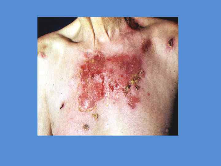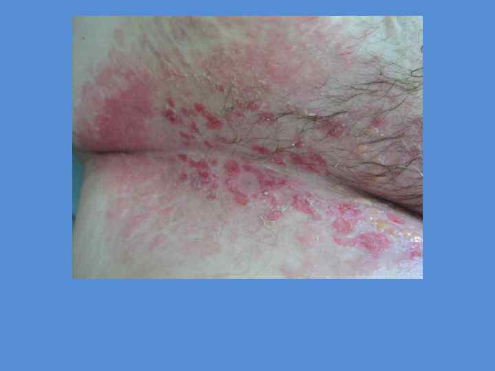 II тип вегетирующей пузырчатки (Hallopeau вегетирующяя пиодермия) • Первичный морфологический элемент – сгрупированные желтоватые пустулы (мелкие акантолитические пузыри с большим скоплением эозинофильных лейкоцитов) • Внутри пузырей, на поверхности эрозий папилломатозные разрастания с мацерированной поверхностью • Выраженные боли