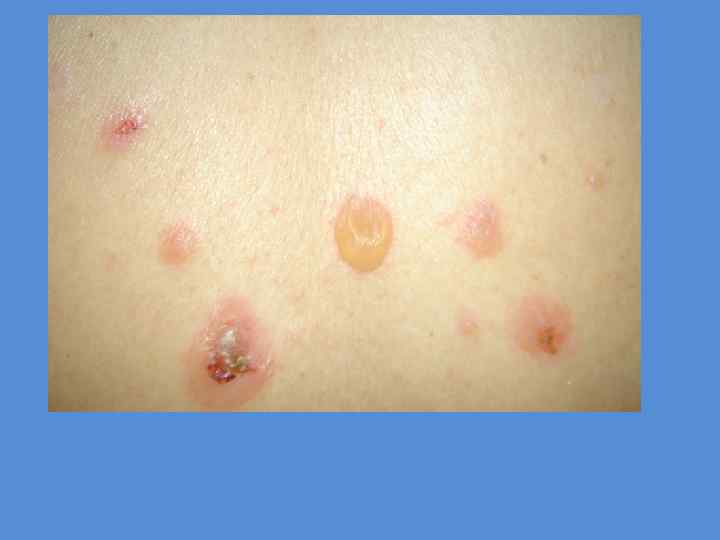 Клиника: • Высыпания распространённые, симметричные, чаще на боковых поверхностях шеи, в подмышечных областях, паховых складках, на сгибательной поверхности конечностей, верхней части живота. • Развитие напряжённых пузырей на видимо неизменённой коже или на фоне отёчной эритемы, выраженный зуд. • Серозное или серозно-геморрагическое содержимое • Групирруются • Эрозии, быстро эпителизируются с образованием гиперпигментации