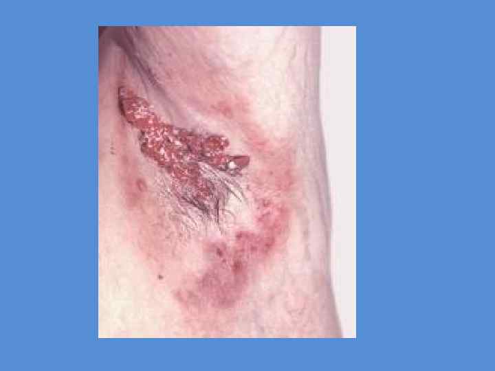 I тип вегетирующей пузырчатки (Neumann) • На поверхности пузырей/эрозий вегетирующие очаги с гиперкератозом • Склонность к росту • Обильный экссудат серозно-гнойный со зловонным запахом (присоединение вторичной флоры) • По периферии узкая эрозированная кайма с остатками пузырей • М. б. на гладкой коже