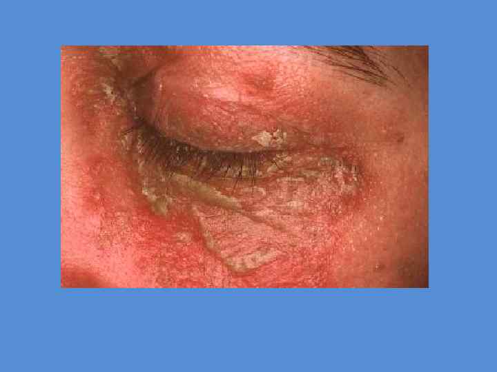 - Слизистые поражаются редко. Сочетает симптомы: Себорейного дерматита (эритема, шелушение) Дискоидной красной волчанки (эритема, инфильтрация, гиперкератоз) Пузырчатки (вялые пузыри)
