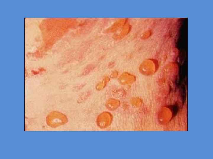 • Тяжёлое злокачественное заболевание • Патогенез Клиника: • Обычно на коже в/ч головы, лица, груди, спины, слизистые не поражаются • Пузыри, эрозии быстро трансформирующиеся в слоистые чешуйко-корки. • Повторное образование на местах прежних эрозий – желтовато-коричневатые чешуйко-корки (слоёное тесто или спресованные листья)