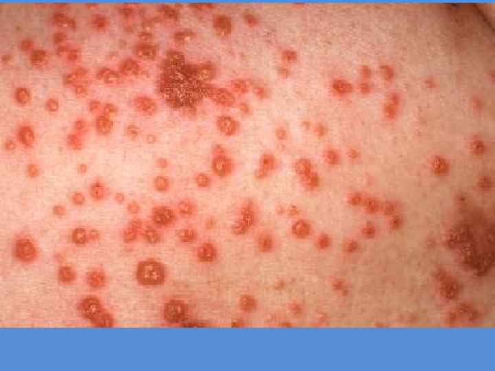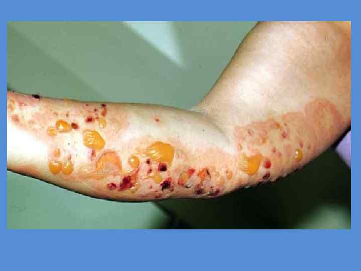 Клиника: Истинный полиморфизм высыпаний Симметричность расположения Сильный зуд, жжение, боль Преимущественно на разгибательных поверхностях конечностей, верхней части спины, животе, ягодицах • Вначале образуются эритема, уртикарии и даже папулы • •