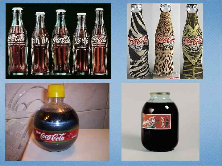 Логоти п X Оригинальное название (по стране Страна продажи происхождения США) Coca-Cola СССР/Россия Название в стране Дата начала продажи Кока-Кола поставок 1979 X Coca-Cola Diet Россия Кока-Кола Диет 1991 X Coca-Cola Light Россия Кока-Кола Лайт 1993 X Coca-Cola Vanilla Россия Кока-Кола Ванилла X Coca-Cola Cherry Россия Кока-Кола Черри Логоти п Оригинальное название Страна продажи окончания Примечание поставок по настоящее время 1993 классическая XX В (после установления промышленной рецептуры) диетическая, низкокалорийная, без сахара по настоящее диетическая, низкокалорийная, время без сахара 2003 2009 Со вкусом ванили 2002 2004 Со вкусом вишни Название в стране Дата начала продажи Дата поставок Дата окончания Примечание поставок классический теперь вариант, X Coca-Cola США Coke 1904 по настоящее время исключивший из состава компоненты растения Кока (лат. Erythroxylu m coca)