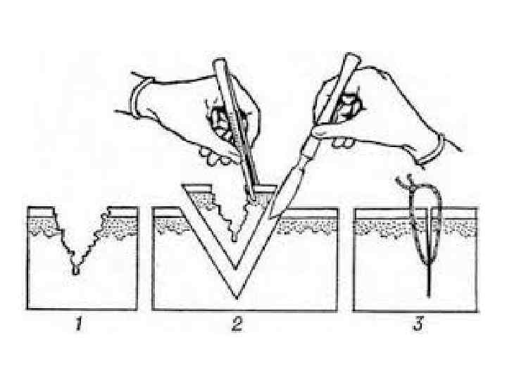 При отсутствии выраженных воспалительных явлений в ране и вокруг рекомендовано наложение следующих швов на рану: 1) первично-отсроченный шов, применяемый через 3– 4 суток после хирургической обработки гнойной раны до развития грануляций; 2) ранний вторичный шов, накладывается в течение 2 -й недели после хирургической обработки на гранулирующую рану до развития в ней рубцовой ткани; 3) поздний вторичный шов — через 3– 4 недели после ранения и позже, когда на месте грануляций уже развилась рубцовая ткань. В таком случае необходимо иссечение рубцовой ткани.