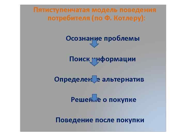 Пятиступенчатая модель поведения потребителя (по Ф. Котлеру): Осознание проблемы Поиск информации Определение альтернатив Решение о покупке Поведение после покупки
