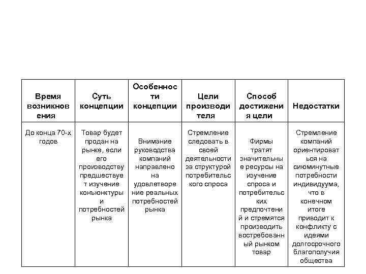 Время возникнов ения До конца 70 -х годов Особеннос ти Суть Цели концепции производи теля Способ достижени я цели Товар будет Стремление продан на следовать в Внимание Фирмы рынке, если руководства своей тратят его компаний деятельности значительны производству направлено за структурой е ресурсы на предшествуе на потребительс изучение т изучение удовлетворе кого спроса и конъюнктуры ние реальных потребительс и потребностей ких потребностей рынка предпочтени рынка й и стремятся производить востребованн ый рынком товар Недостатки Стремление компаний ориентироват ься на сиюминутные потребности индивидуума, что в конечном итоге приводит к конфликту с идеями долгосрочного благополучия общества
