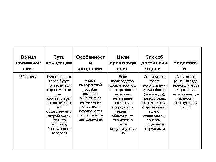 Время возникнов ения 80 -е годы Суть Особенност концепции и концепции Цели производи теля Качественный товар будет пользоваться спросом, если он соответствует неэкономическ им общественным потребностям (защита экологии, безопасность товаров) Если Достигается производство, путем удовлетворяющ технологически ее потребность, х разработок вызывает (инноваций), негативные позволяющих процессы в позиционироват природе или ь предприятие вредит по его обществу, то отношению к оно должно природе. быть обществу и модифицирова сотрудникам но В ходе конкурентной борьбы компании акцентируют внимание на полезности/ безопасности своих товаров для общества Способ достижени я цели Недостатк и Отсутствие решения ряда технологически х проблем, вызывающих, в частности, высокую цену товара