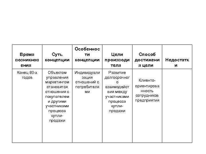 Время возникнов ения Конец 80 -х годов Особеннос ти Суть Цели концепции производи теля Объектом управления маркетингом становятся отношения с покупателем и другими участниками процесса куплипродажи Индивидуали зация отношений с потребителя ми Развитие долгосрочног о взаимодейст вия между участниками процесса куплипродажи Способ достижени я цели Клиентоориентирова нность сотрудников предприятия Недостатк и