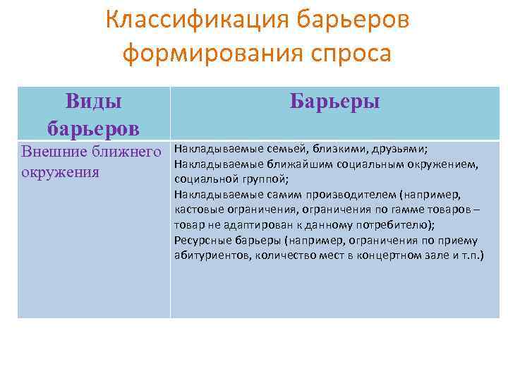 Классификация барьеров формирования спроса Виды барьеров Внешние ближнего окружения Барьеры Накладываемые семьей, близкими, друзьями; Накладываемые ближайшим социальным окружением, социальной группой; Накладываемые самим производителем (например, кастовые ограничения, ограничения по гамме товаров – товар не адаптирован к данному потребителю); Ресурсные барьеры (например, ограничения по приему абитуриентов, количество мест в концертном зале и т. п. )