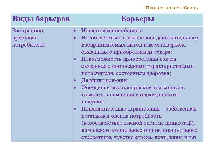Продолжение таблицы Виды барьеров Внутренние, присущие потребителю Барьеры Неплатежеспособность: Несоответствие (ложное или действительное) воспринимаемых выгод и всех издержек, связанных с приобретением товара; Невозможность приобретения товара, связанная с физическими характеристиками потребителя, состоянием здоровья; Дефицит времени; Ощущение высоких рисков, связанных с товаром, и сомнения в оправданности покупки; Психологические ограничения – собственная негативная оценка потребности (несоответствие личной системе ценностей), комплексы, социальные или индивидуальные стереотипы, чувство страха, лени, вины и т. п.