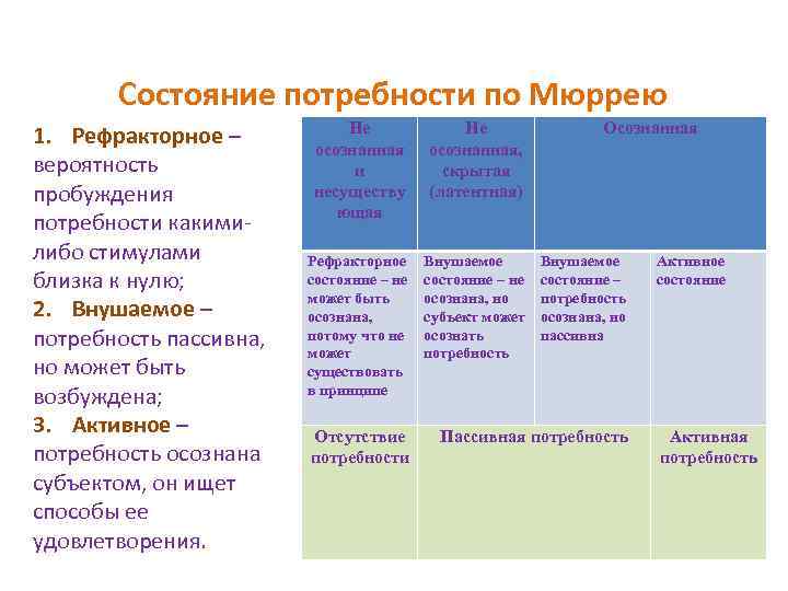 Состояние потребности по Мюррею 1. Рефракторное – вероятность пробуждения потребности какимилибо стимулами близка к нулю; 2. Внушаемое – потребность пассивна, но может быть возбуждена; 3. Активное – потребность осознана субъектом, он ищет способы ее удовлетворения. Не осознанная и несуществу ющая Не осознанная, скрытая (латентная) Рефракторное состояние – не может быть осознана, потому что не может существовать в принципе Внушаемое состояние – не осознана, но субъект может осознать потребность Отсутствие потребности Осознанная Внушаемое состояние – потребность осознана, но пассивна Пассивная потребность Активное состояние Активная потребность