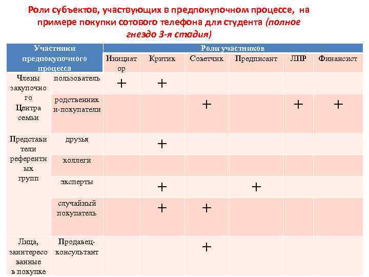 Роли субъектов, участвующих в предпокупочном процессе, на примере покупки сотового телефона для студента (полное гнездо 3 -я стадия) Участники Инициат предпокупочного процесса ор Члены пользователь закупочно го родственник Центра и-покупатели семьи + Представи тели референтн ых групп друзья Критик Роли участников Советчик Предписант случайный покупатель Лица, Продавецзаинтересо консультант ванные в покупке Финансист + + + коллеги эксперты ЛПР + + +