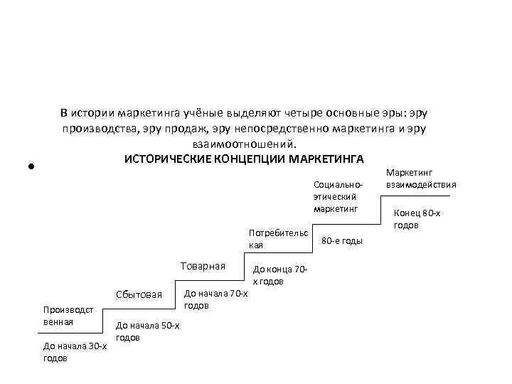 • В истории маркетинга учёные выделяют четыре основные эры: эру производства, эру продаж, эру непосредственно маркетинга и эру взаимоотношений. ИСТОРИЧЕСКИЕ КОНЦЕПЦИИ МАРКЕТИНГА Социальноэтический маркетинг Потребительс кая Товарная Сбытовая Производст венная До начала 30 -х годов До начала 50 -х годов До начала 70 -х годов До конца 70 х годов 80 -е годы Маркетинг взаимодействия Конец 80 -х годов