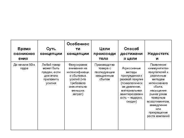 Время возникнов ения До начала 50 -х годов Особеннос ти Суть Цели концепции производи теля Любой товар может быть продан, если для этого приложить усилия Фокусировка внимания на интенсификаци и сбытовых усилий (что требовало значительно меньших затрат) Производство товара с последующим изощренным сбытом Способ достижени я цели Недостатк и Появление Агрессивные «иммунитета» методы покупателей к принуждения к различным разовой покупке методам (психологическ интенсивного ое давление, сбыта, материальная насыщение заинтересованн рынка узким ость – подарки, товарным скидки) ассортиментом, замедление или прекращение роста компаний