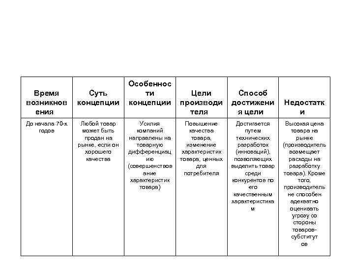 Время возникнов ения До начала 70 -х годов Особеннос ти Суть Цели концепции производи теля Любой товар может быть продан на рынке, если он хорошего качества Усилия компаний направлены на товарную дифференциац ию (совершенствов ание характеристик товара) Повышение качества товара, изменение характеристик товара, ценных для потребителя Способ достижени я цели Достигается путем технических разработок (инноваций), позволяющих выделить товар среди конкурентов по его качественным характеристика м Недостатк и Высокая цена товара на рынке (производитель возмещает расходы на разработку товара). Кроме того, производитель не способен адекватно оценивать угрозу со стороны товаровсубститут ов